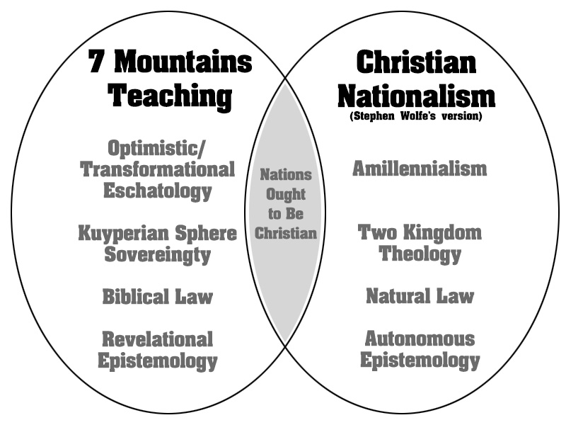 When church, family and governmental leaders promote fundamental rights, all faiths will have ample opportunities to build educational, religious, governmental (judicial), business, arts, media, and family institutions that honor God. Faiths without proven templates in these 7 areas will struggle and turn to the government for help with what the family and religious congregation can do best. Faiths with proven templates can show that there are familial and religious solutions to overcome the problems throughout culture. To learn more about these proven templates for strengthening relationships on the 7 mountains, see the following diagram, which explains how God (as He makes Himself known through the means of grace, doctrines of grace, and covenant of grace) undergirds the government, family, and church (www.covenant.net/3Institutions) as well as "rooms" where Godly people gather while affirming the Lordship of Christ. See, e.g. www.Covenant.net/5Rooms. For more information about how these 3 institutions and 5 rooms form a foundation for God-honoring culture, see www.Covenant.net/1000Points. To see how 7 Mountain theology differs from dominionism/nationalism, see the Venn diagram at the bottom of this page[2]. Please also see related content at the following links: