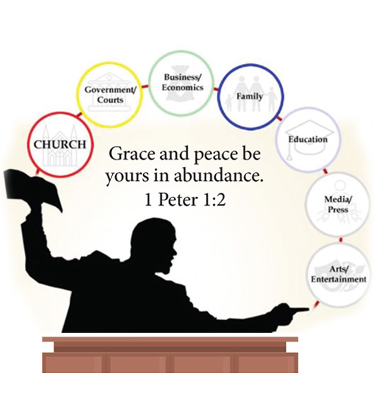 Christians across the generations have united to emphasize Trinitarian leadership in the above 7 spheres. Ideally, the leaders of churches, families, governments and related mediating institutions all focus on the leading of the Spirit, the Lordship of Christ, and the love of God, the lawgiver. Mediating instution leaders come to know and reflect the character of the Father, Son and Holy Spirit through the means of grace: the Word, prayer, and sacraments. These means of grace have practical applications on the 7 mountains through preaching, prayer, and peacemaking; see, e.g., covenant.net/MeansOfGrace.