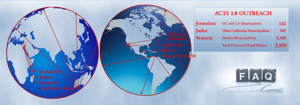 Orange County ("OC") has 34 Municipalities and Los Angeles has 88 Municipalities. Success in building churches in OC and LA can inspire development of successful church models in all 482 California municipalities. This can then inspire the building of mature churches in the 2438 municipalities of Mexico. In this way, churches can reach more than 150 million people. As churches in California and Mexico increasingly transform culture, the success should spread from "Jerusalem and Judea" to Samaria and the ends of the earth.