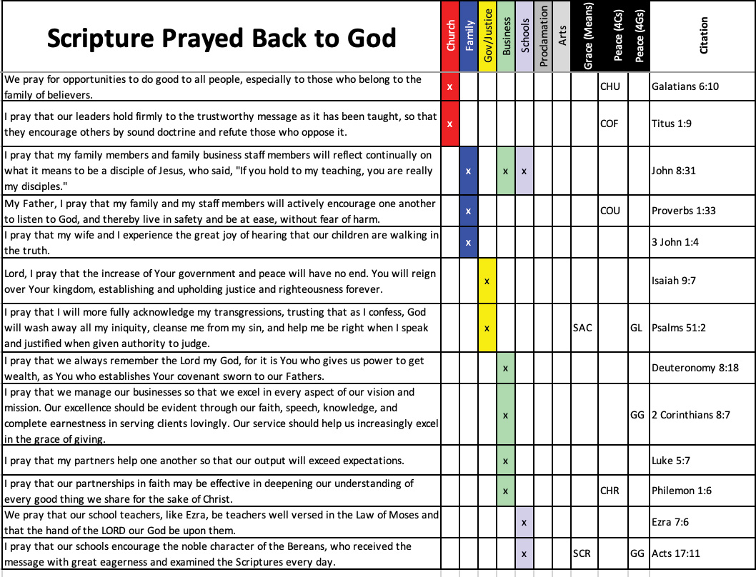 We pray Scripture back to God to support leaders bringing grace and peace into churches, families, governments, schools and businesses. See, e.g., www.covenant.net/SpheresKingdomManifesto